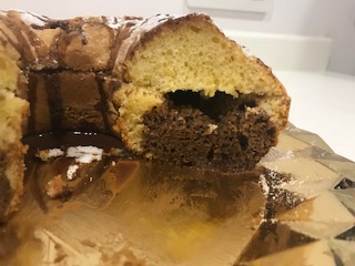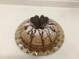 Con estas dos sencillas elaboraciones realizamos este bizcocho tan vistoso y sabroso simplemente cortando la superficie (o barriga) del bizcocho ya cocido, sacando un poco de miga y rellenándo con la ganache, posteriormente volveremos a colocar la superficie cortada anteriormente y decoraremos con azúcar glasé y un poco de ganache.