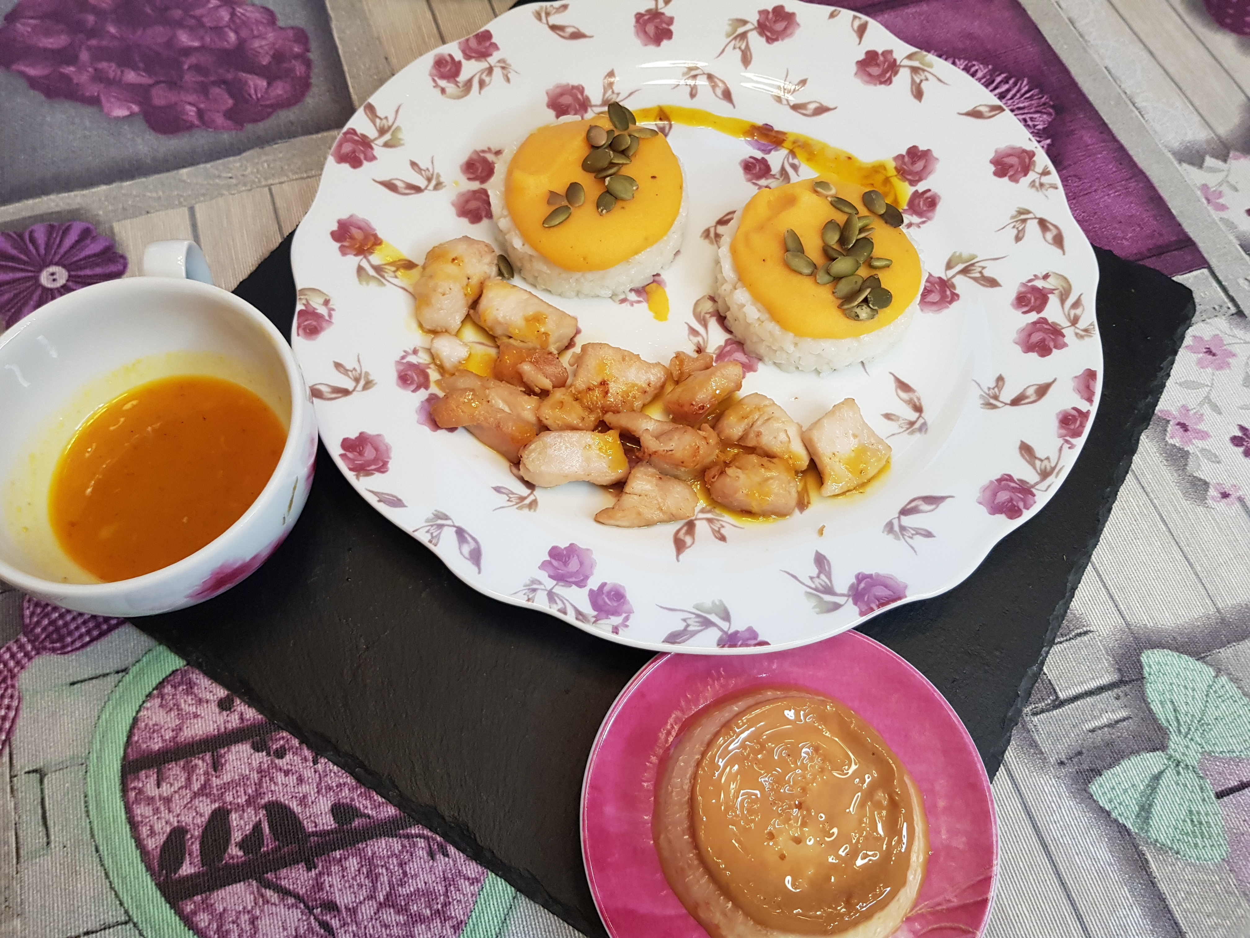 (Para aprovechar al máximo la thermomix yo puse en la bandeja del varoma unos flanes y tener listo el postre también mientras se hacía al varoma la calabaza y la patata.)