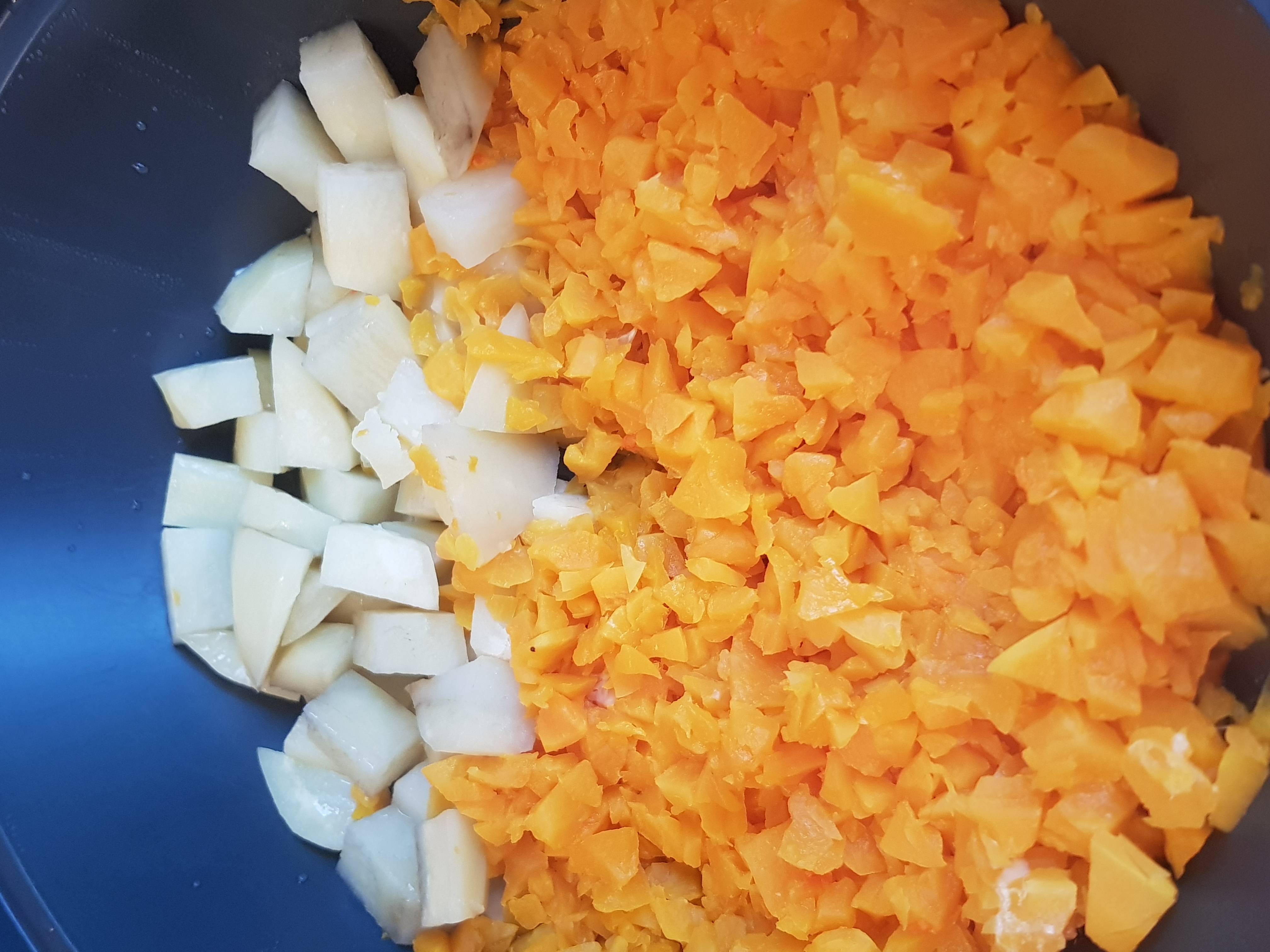 Ponga la calabaza en el vaso y trocee 5 seg/vel 5. Vierta en el recipiente Varoma. Sitúe el recipiente Varoma en su posición y pese las patatas. Tape el Varoma y reserve.