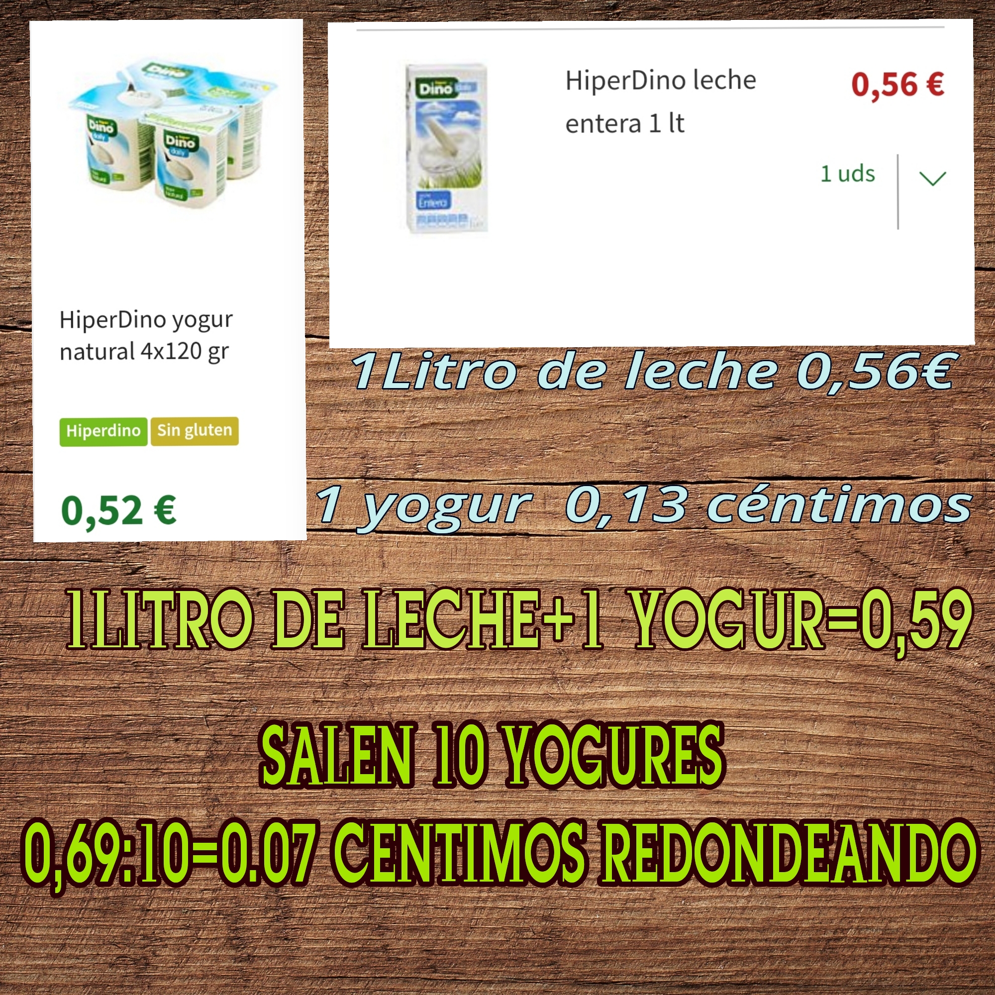 Hice la comparación con productos de marca blanca, si comparamos con otras marcas aún nos sale más barato. Para hacer nuestros yogures caseros solo necesitamos 1 litro de leche y 1 yogur natural. El precio del yogur del Super nos sale a 0,13 céntimos. Nos gastamos para hacerlos en casa, 59 céntimos y nos salen 10 yogures, con lo cual no sale cada yogur 0,07 céntimos haciéndolos en casa, y no sólo es eso, tenemos la ventaja de que obtenemos un producto natural sin aditivos, ni azucares, ni conservantes,y de los yogures que sacamos podemos guardar 1 para hacer la siguiente vez, eso se puede hacer 4 o 5 veces porque el yogur va perdiendo sus propiedades.