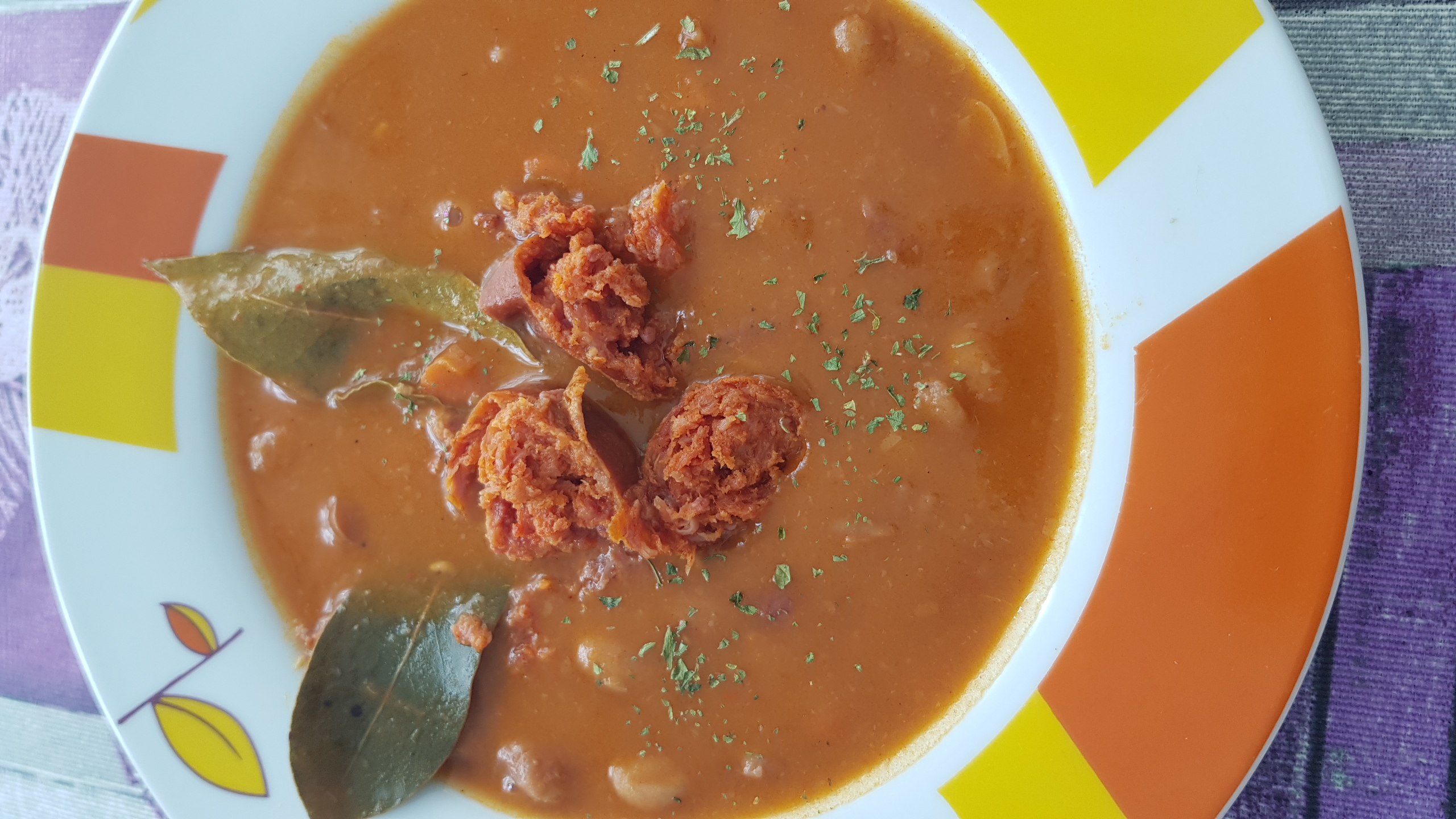 Triturar todo a vel/10.Añadir las alubias, 1 capadura de chorizo de las que venden individuales, yo la puse entera para que no se estropeara y con piel, y era ahumado.