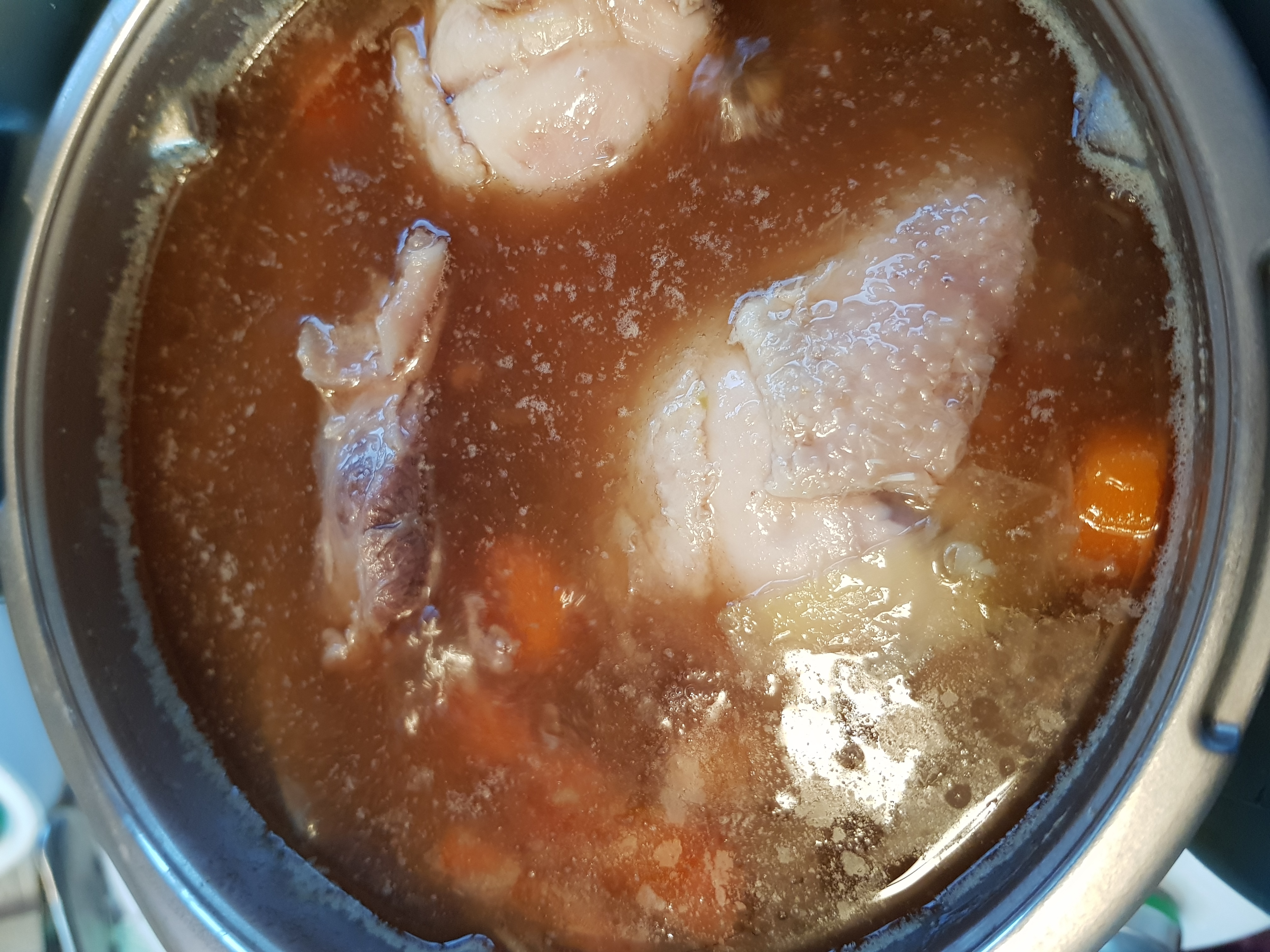 Continuamos con el vaso de el thermomix ,colocamos el cubrecuchillas añadimos los ajos,la patata(esta se va a deshacer pero le va a dar espesor al caldo),la zanahoria,y el resto de carne y huesos,añadimos 1 cuchara de sal y cubrimos hasta el máximo de agua.