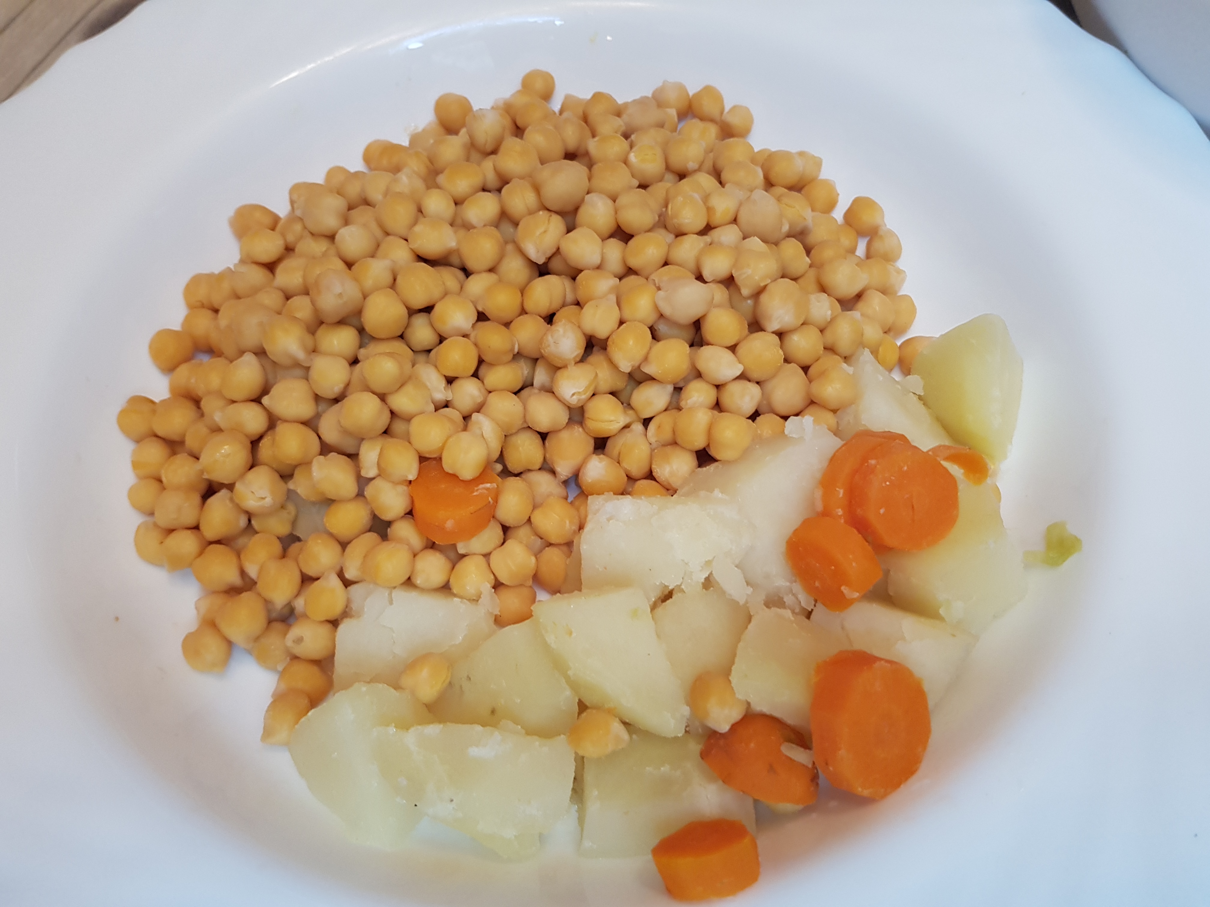 En el cestillo vamos a colocar los garbanzos ,unos trozos de patata si nos gusta comerla con los garbanzos y la sopa ,los ponemos en el cestillo para que no se deshaga,el repollo y algun trozo de zanahoria.