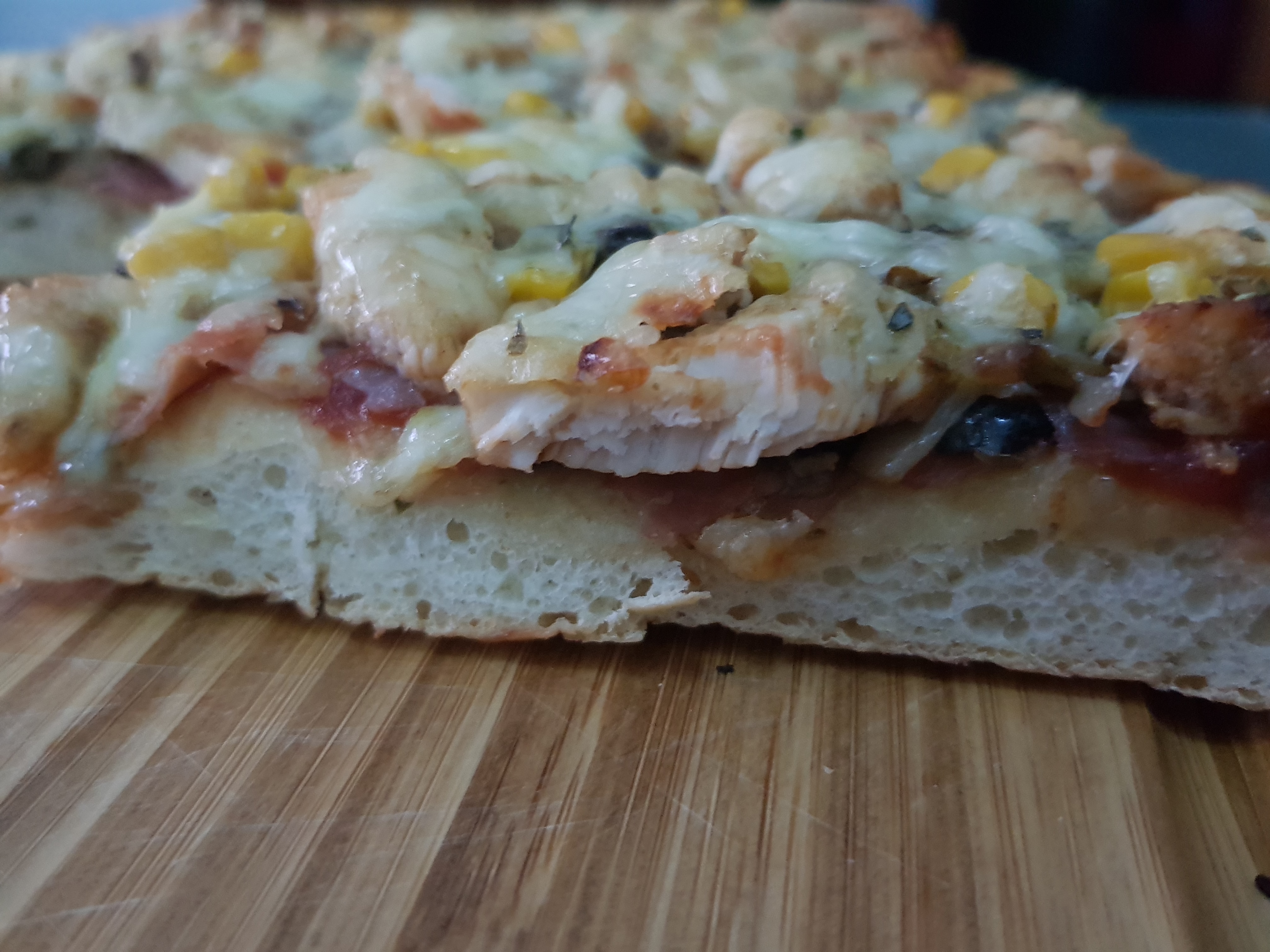 Este di bien la masa y me parecía que iba a quedar fina porque a nosotros nos gusta más gordita pero una vez la puse en el horno subió bastante. Os animo a que lo probéis.
