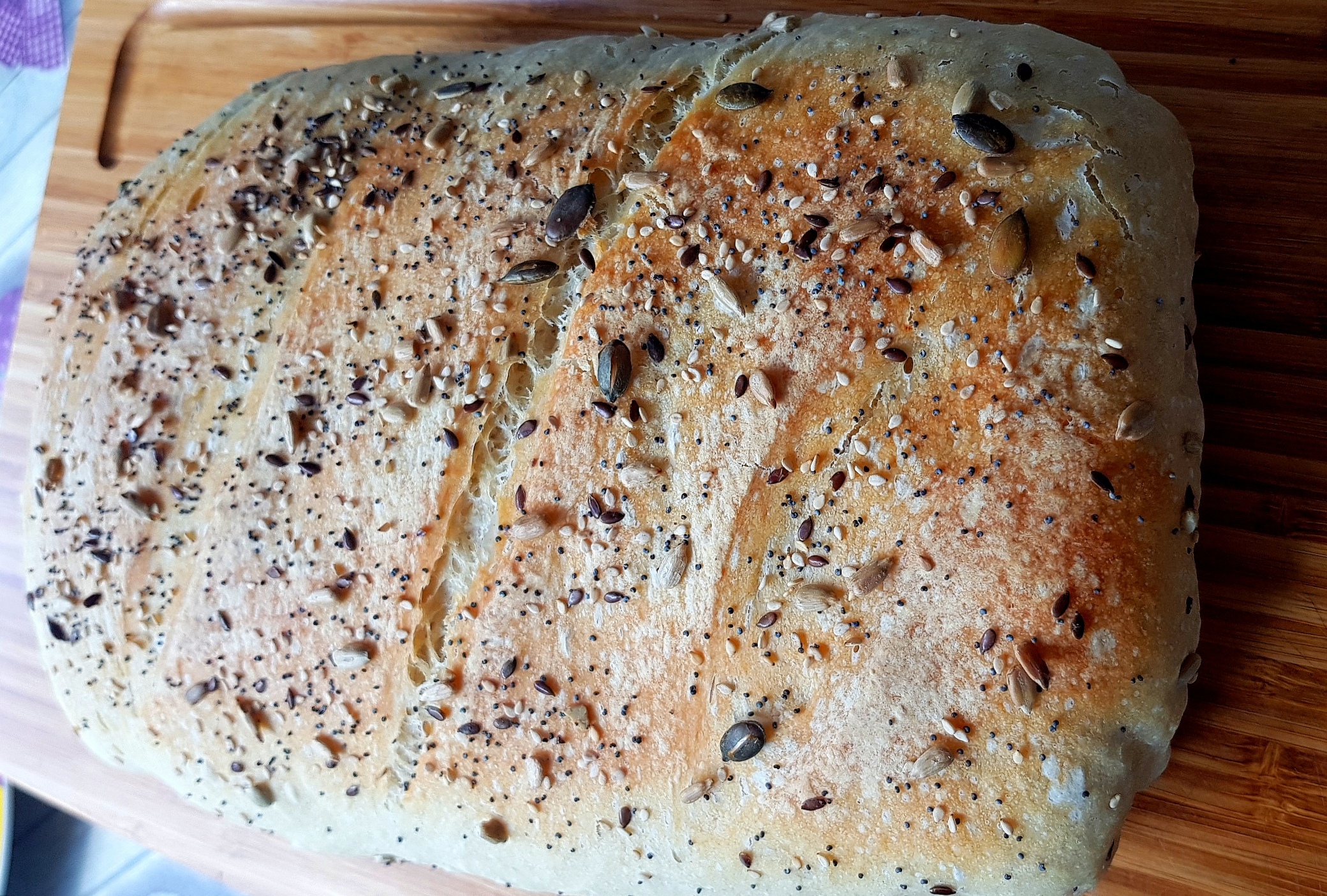 De la receta he cambiado 2 cosas , no tenía levadura seca y le puse 25g de fresca,a la hora de fermentar lo puse de forma manual y programe 2h y 30m /45°/fermentar y Le añadí unas semillas por encima.