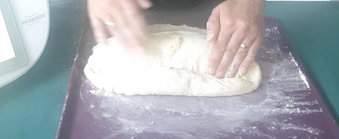 5.Retiramos la masa una vez haya crecido a la superficie de trabajo que también tendremos enharinada, y vamos enrollando la masa hacia y presionando el borde, volvemos a enrollar y presionamos, así hasta que tengamos la masa enrollada.