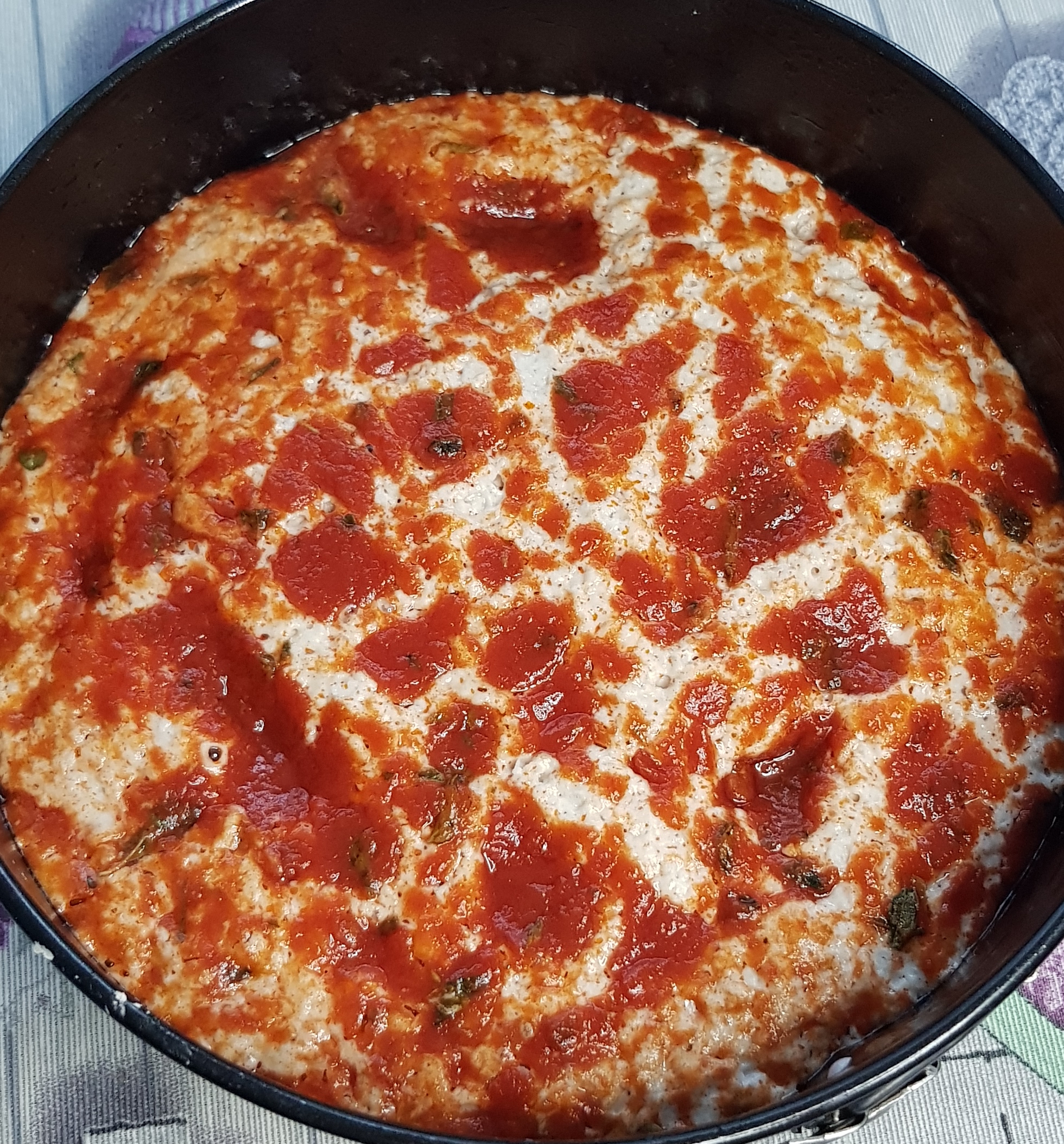 Ponga en el vaso el tomate, la sal y el orégano y mezcle 10 seg/vel 4. Vierta el tomate sobre la masa, repártalo por la superficie y deje fermentar durante aprox. 2 horas.