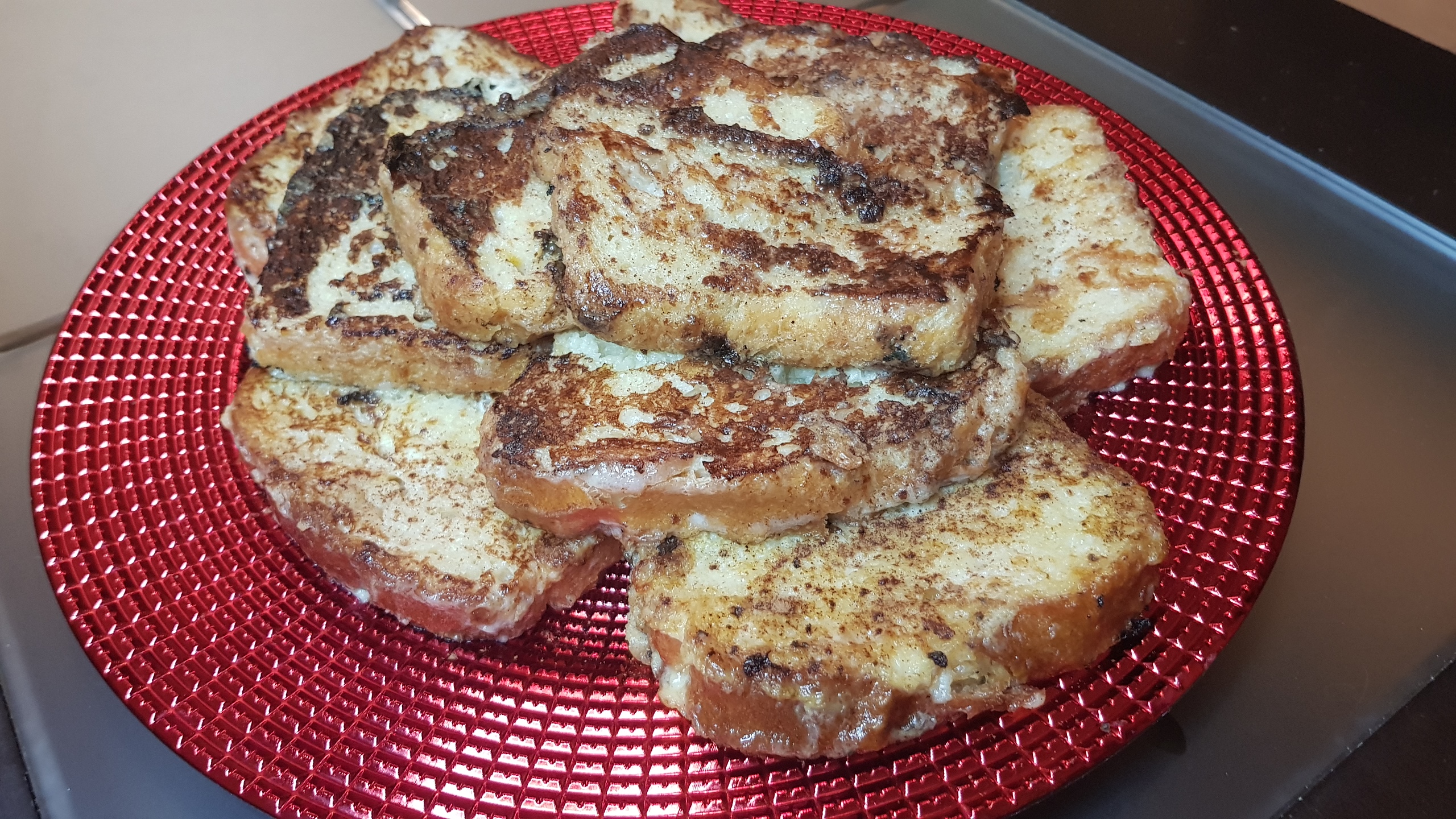 Se podrían hacer fritas, al vapor o a la plancha que ha sido como yo las hice,para ello ponemos la sarten con 2 cucharas de aceite y cuando este caliente poner las toriijas vuelta y vuelta y espolvorear con un poquito de canela.